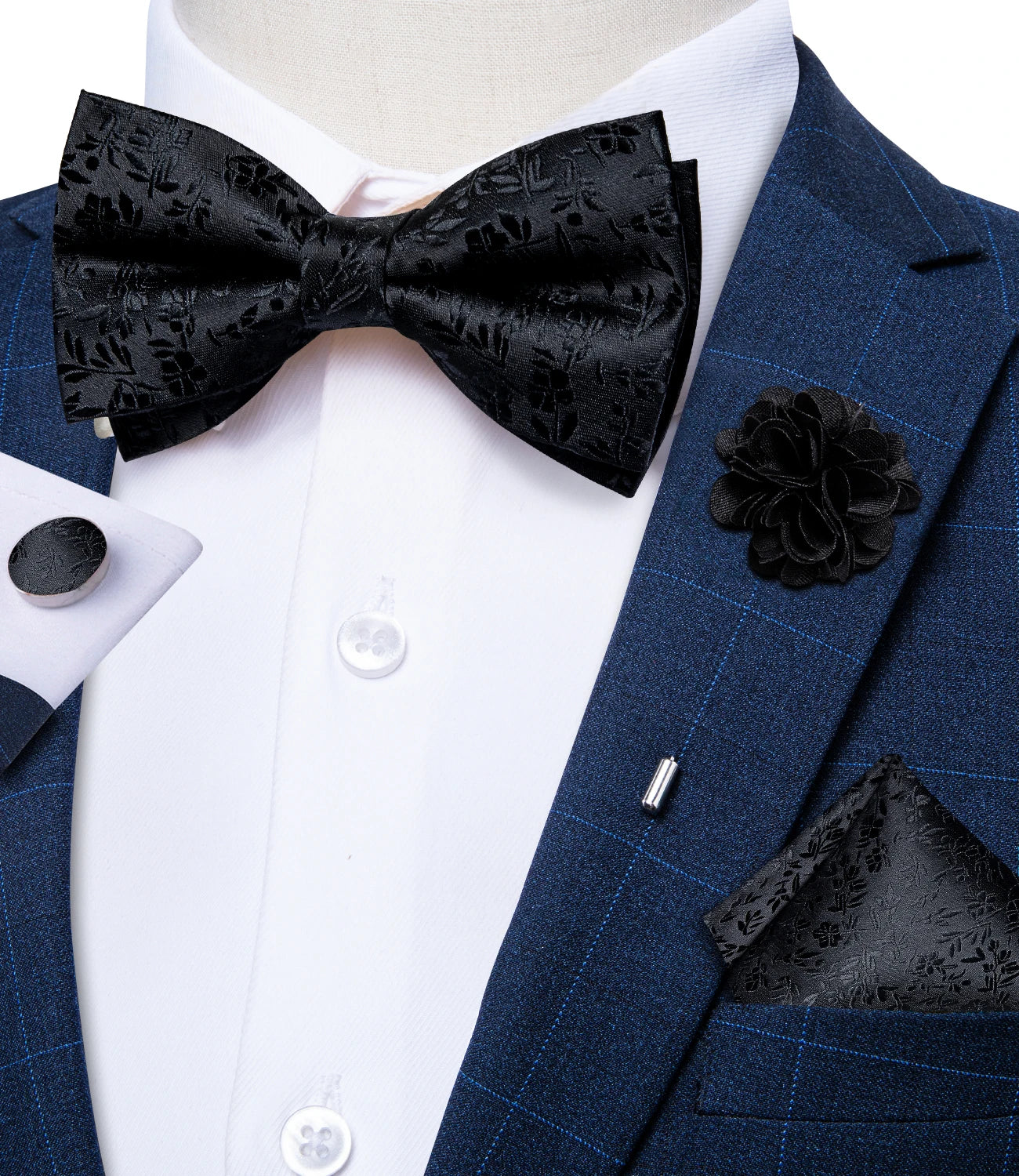 • Cor e Padrão: Na cor preta clássica, a gravata borboleta e o lenço de bolso apresentam um elegante padrão jacquard sutil, que confere profundidade e interesse visual sem sobrecarregar, ideal para um estilo refinado.
