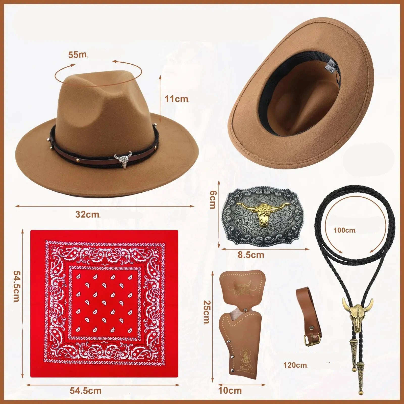 Peças Inclusas: Chapéu + Colete + Colar + Lenço de cabeça + Fivela de cós + Cós + Coldre