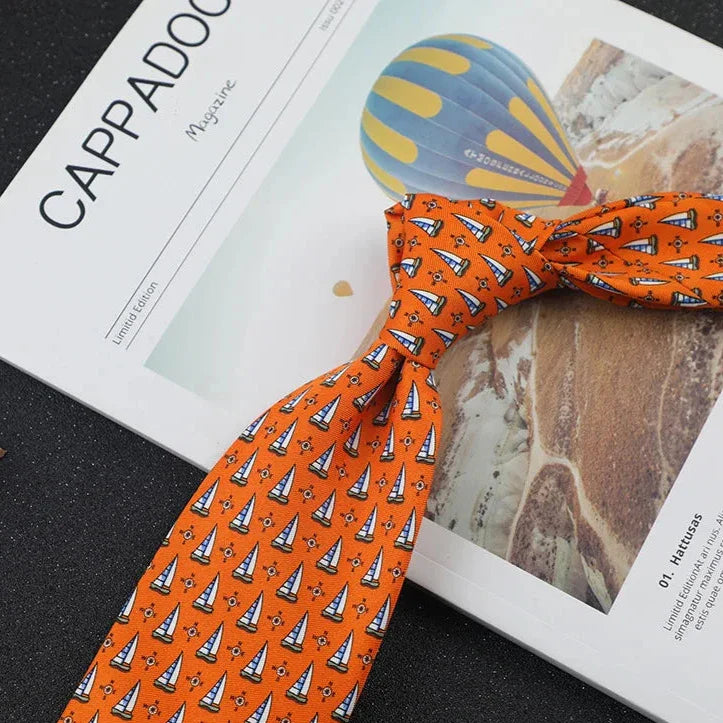 Eleve seu estilo com a Gravata Masculina Tradicional em Seda Laranja com estampa de Barcos. Uma peça sofisticada e vibrante, ideal para adicionar um toque náutico e elegante ao seu visual.